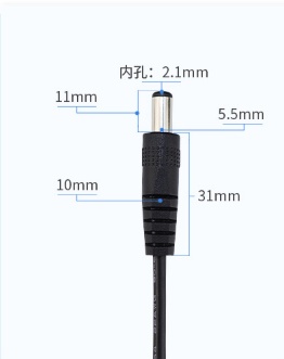 Specifications: Power plug outer diameter: 5.5 mm (MM) Inner diameter: 2.1 mm (MM)